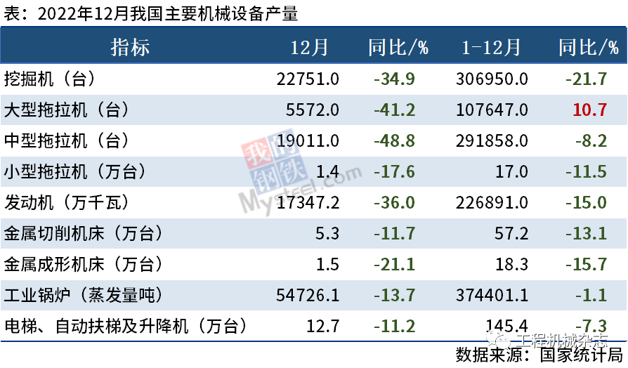 國家統計局最新數據顯示,2022年12月挖掘機產量22751臺,同比下降34.9%。2022年全年累計產量306950臺,同比下降21.7%。拖拉機方面,12月大中小型拖拉機產量分別為5572臺、19011臺、1.4萬臺,同比分別下降41.2%、48.8%…......