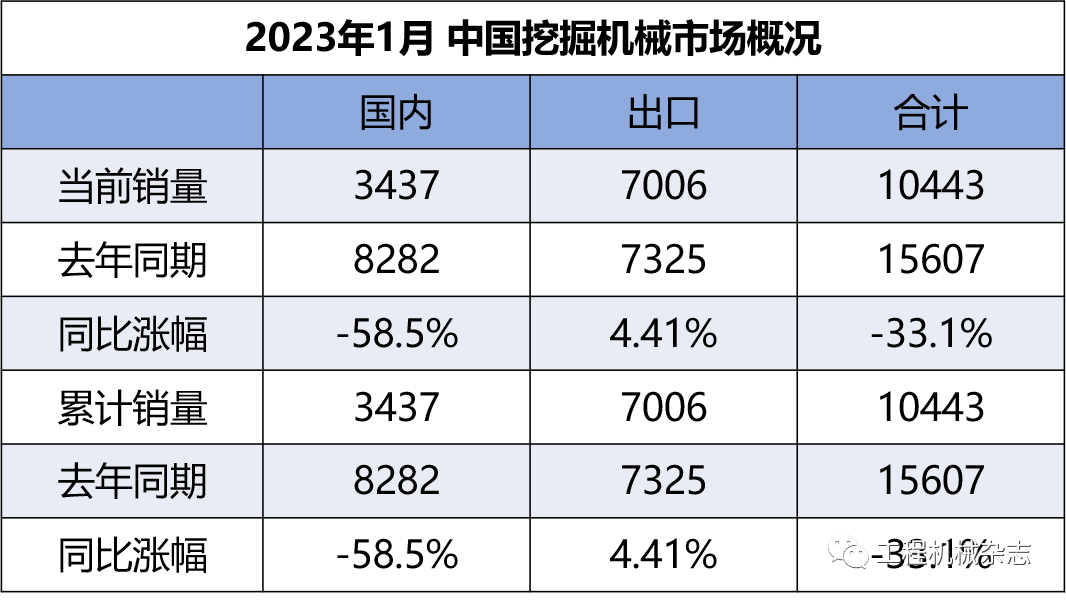 據中國工程機械工業協會對26家挖掘機制造企業統計,2023年1月銷售各類挖掘機10443臺,同比下降33.1%,其中國內3437臺,同比下降58.5%;出口7006臺,同比下降4.41%。[數據來源:中國工程機械工業協會]......