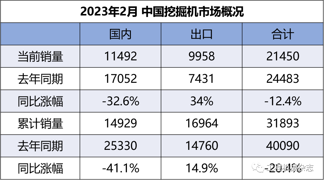 據中國工程機械工業協會對挖掘機主要制造企業統計,2023年2月銷售各類挖掘機21450臺,同比下降12.4%,其中國內11492臺,同比下降32.6%;出口9958臺,同比增長34%。2023年1-2月,共銷售挖掘機31893臺,同比下降20.4%;…......