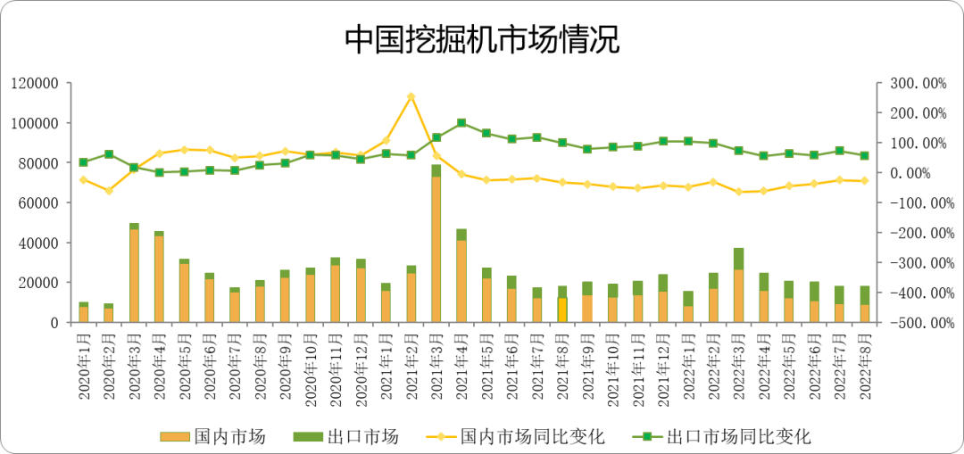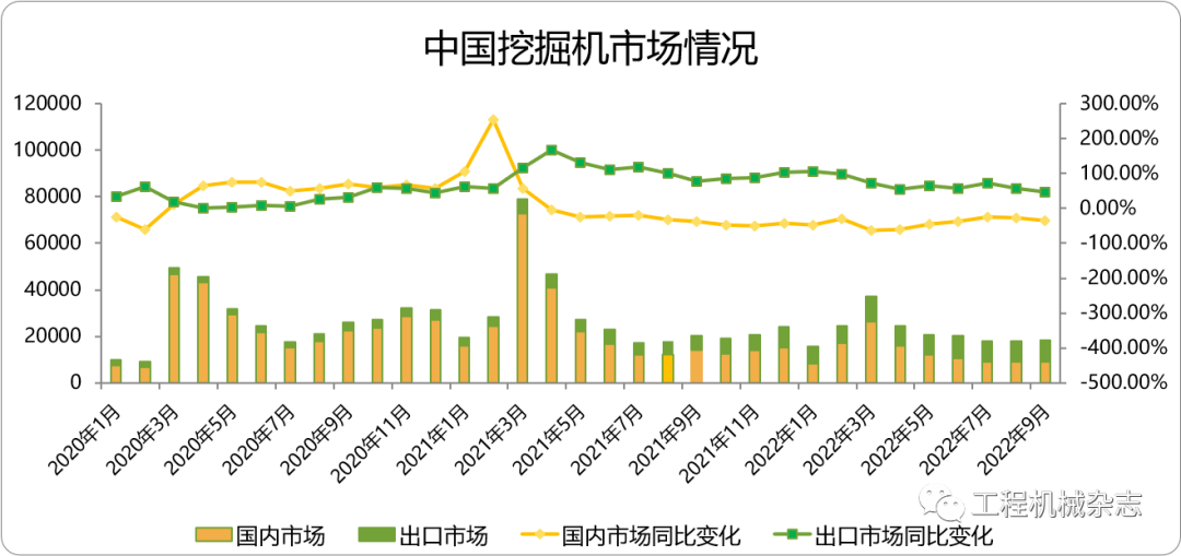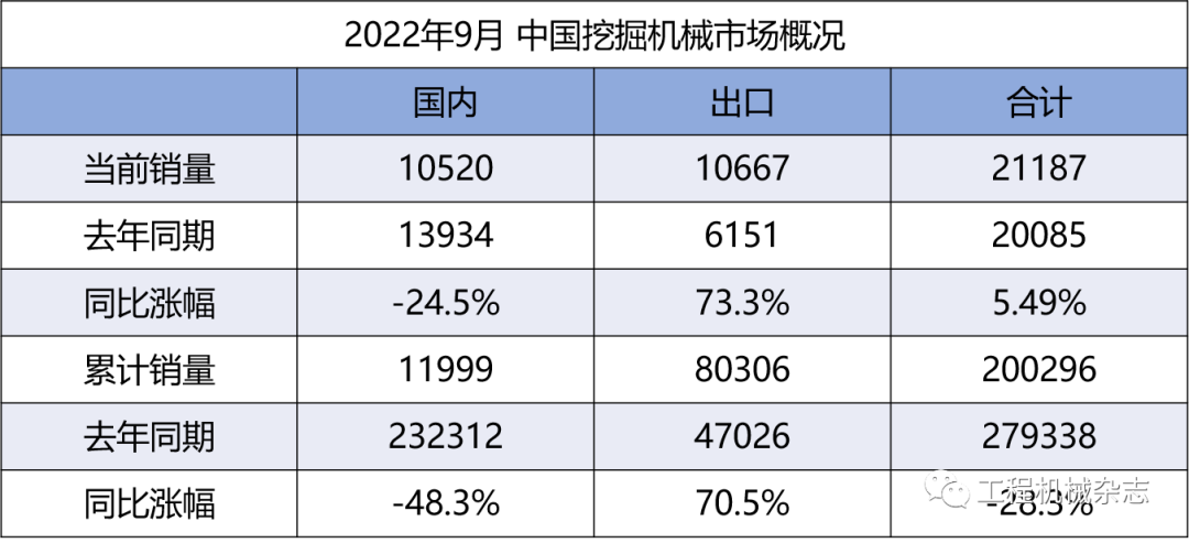 據(jù)中國工程機械工業(yè)協(xié)會對26家挖掘機制造企業(yè)統(tǒng)計,2022年9月銷售各類挖掘機21187臺,同比增長5.49%,其中國內(nèi)10520臺,同比下降24.5%;出口10667臺,同比增長73.3%。 2022年1-9月,共銷售挖掘機200296臺,同比下降28…......