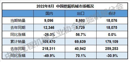 根據(jù)中國工程機械工業(yè)協(xié)會行業(yè)統(tǒng)計數(shù)據(jù),2022年1—8月納入統(tǒng)計的26家主機制造企業(yè),共計銷售各類挖掘機械產(chǎn)品179,109臺,同比下降30.9%。其中,國內(nèi)市場銷量109,470臺,同比下降49.9%;出口銷量69,639臺,同比增長70.…......