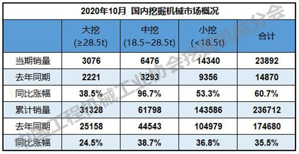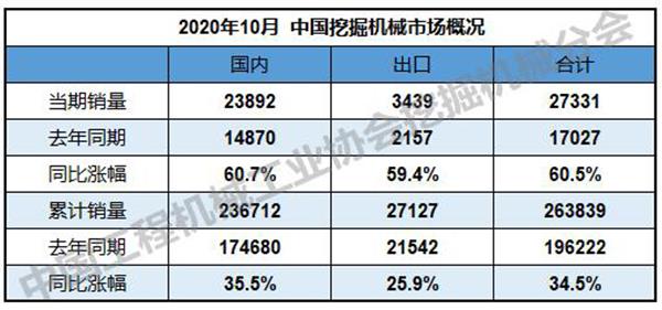 據中國工程機械工業協會統計,2020年10月納入統計的25家挖掘機制造企業共銷售各類挖掘機27331臺,同比增長60.5%;其中國內23892臺,同比增長60.7%;出口3439臺,同比增長59.4%。