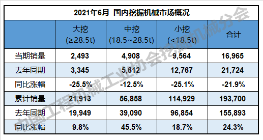 根據中國工程機械工業協會行業統計數據,2021年1—6月納入統計的26家主機制造企業,共計銷售各類挖掘機械產品223,833臺,同比漲幅31.3%。其中,國內市場銷量193,700臺,同比漲幅24.3%;出口銷量30,133臺,同比漲幅107.4%。