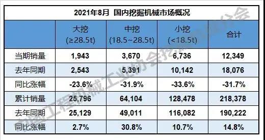 據中國工程機械工業協會對25家挖掘機制造企業統計,2021年8月銷售各類挖掘機18075臺,同比下降13.7%;其中國內12349臺,同比下降31.7%;出口5726臺,同比增長100%。