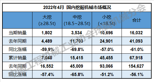 2022年1—4月,共計銷售各類挖掘機械產品101709臺,同比下降41.4%。其中,國內市場銷量67918臺,同比下降56.1%;出口銷量33791臺,同比增長78.9%。