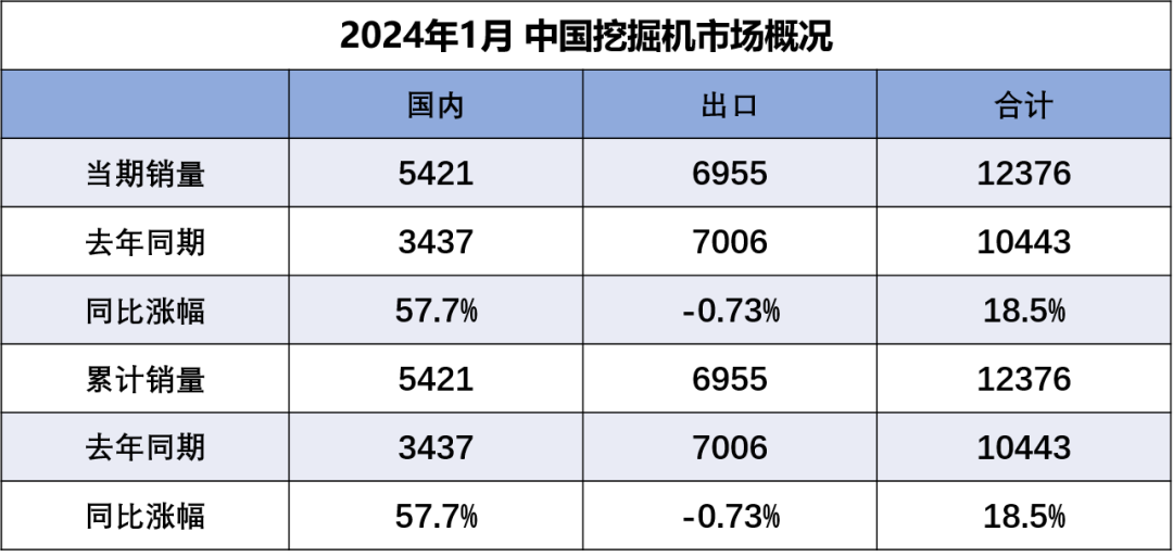 2024年1月挖掘機國內市場銷量5421臺,同比增長57.7%